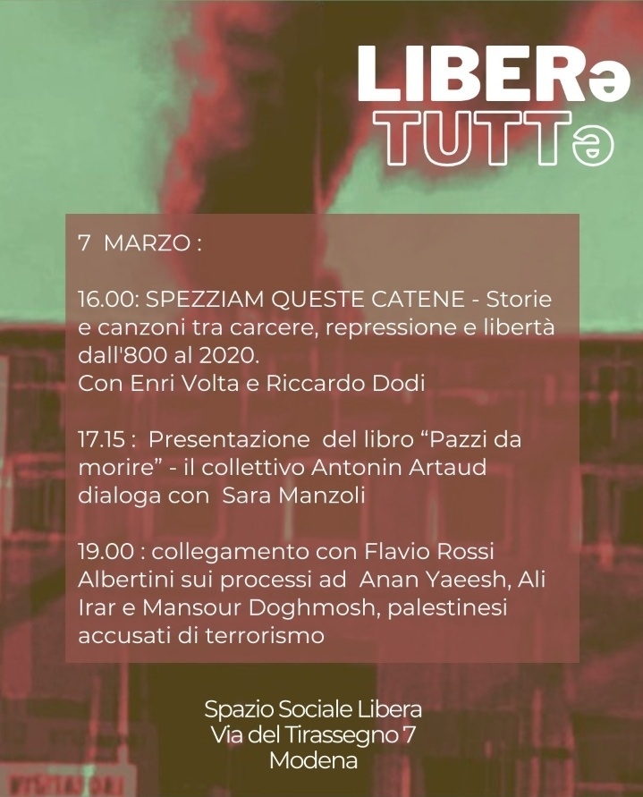 DIBATTITOpalestinapsichiatriaCarceremusicalibriantipsichiatriacollettivo antipsichiatrico Antonin ArtaudComitato verità e giustizia per i morti de Sant'AnnaliberaLiberx tuttxlotta anticarceraria