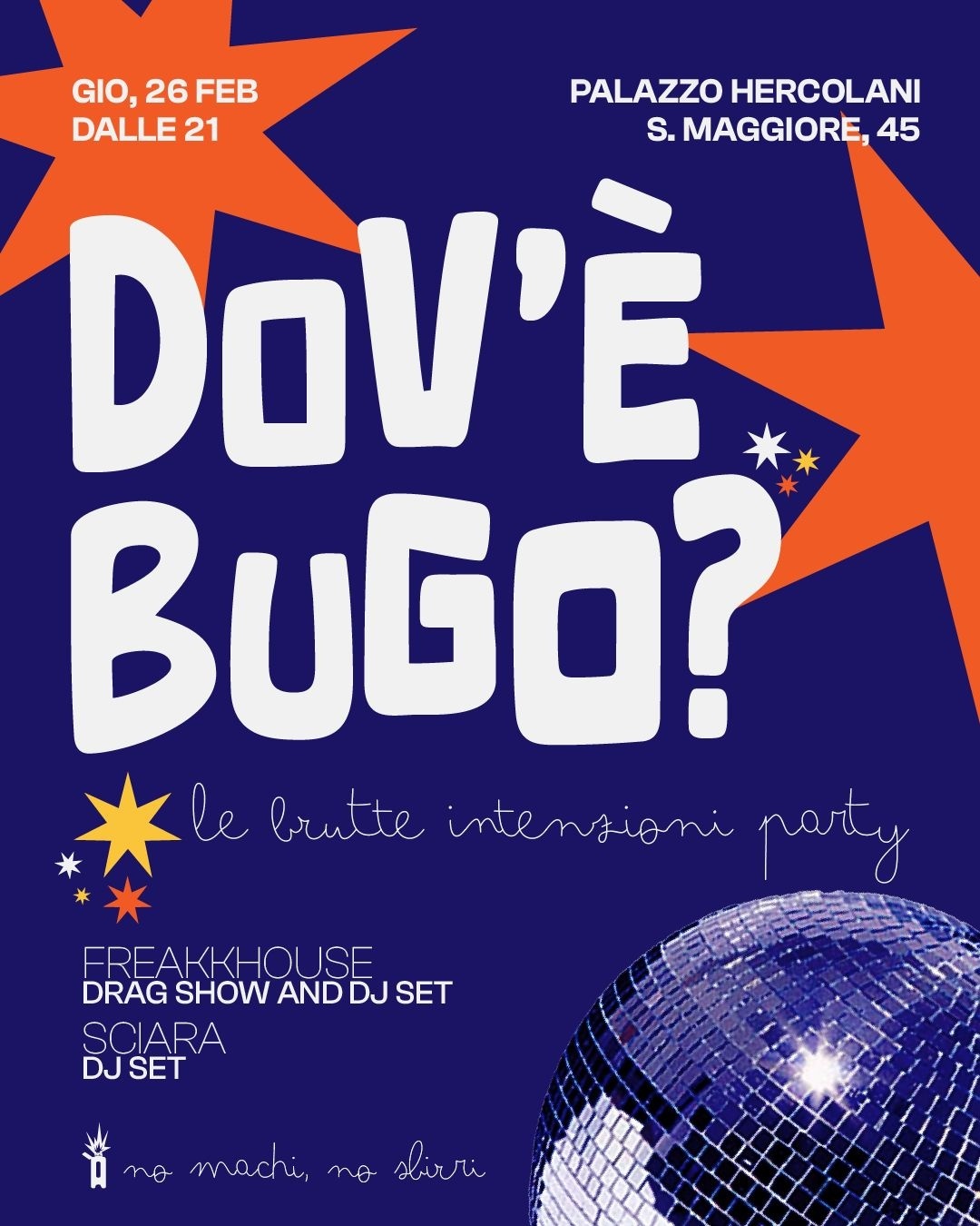 Giovedì 26 febbraio, dalle ore 21:00, Palazzo Hercolani si trasforma in un palcoscenico esplosivo per il DOV’È BUGO? – Le Brutte Intenzioni Party. Preparatevi a una notte indimenticabile con lo show mozzafiato di Freakkhouse Drag Show e i ritmi travolgenti dei DJ set di Freakkhouse e Sciara.