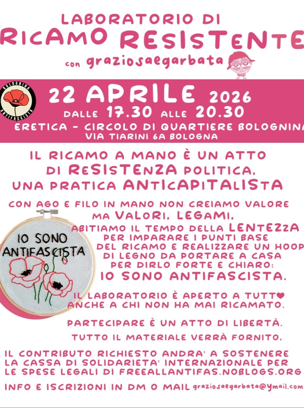Durante il laboratorio imparerai i punti base del ricamo per realizzare il progetto in foto da portare a casa per dirlo forte e chiaro: IO SONO ANTIFASCISTA; ricamerai anche i papaveri, simboli della Resistenza.