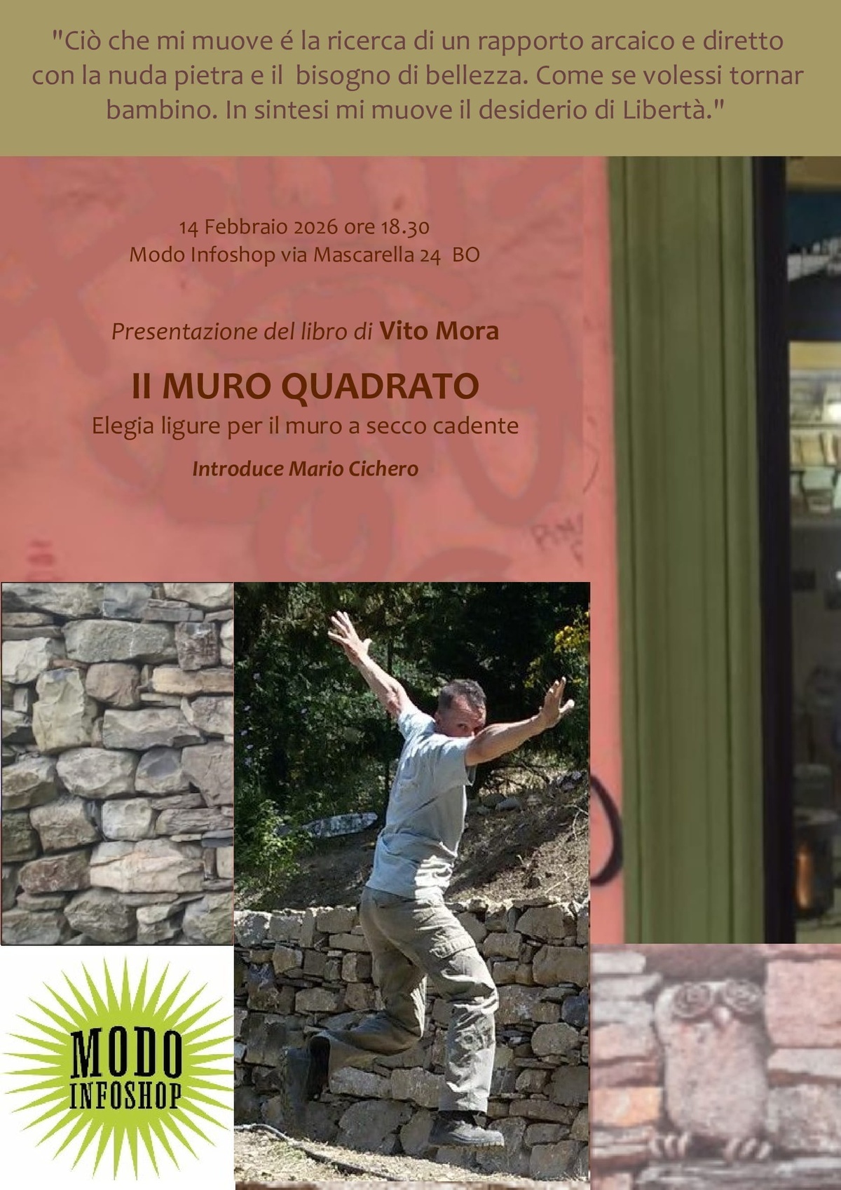 "Dopo “Il buco quadrato”, nel quale ha raccontato della sua decisione di lasciare un posto molto fisso in Ferrovia e “Il butoh quadrato”, nel quale ha raccontato del suo viaggio alla scoperta del butoh, con questo libro, "Il muro quadrato - Elegia del muro a secco cadente", Vito Mora, chiude definitivamente un’appassionata, quasi inspiegabile, “Trilogia del quadrato”. L'autore scrive del suo rapporto speciale con il muro a secco, un elemento architettonico fondamentale del territorio in cui vive, la Val Prino nell'entroterra di Imperia Porto Maurizio, che sta inesorabilmente crollando, portandosi dietro pietre, terra, ulivi e una visione superata di mondo. Il libro è edito dalla rinata Edizioni Storie Tese (EST), storica, preistorica, casa editrice molto attiva nel mondo delle autoproduzioni dalla metà degli anni ottanta del secolo scorso."