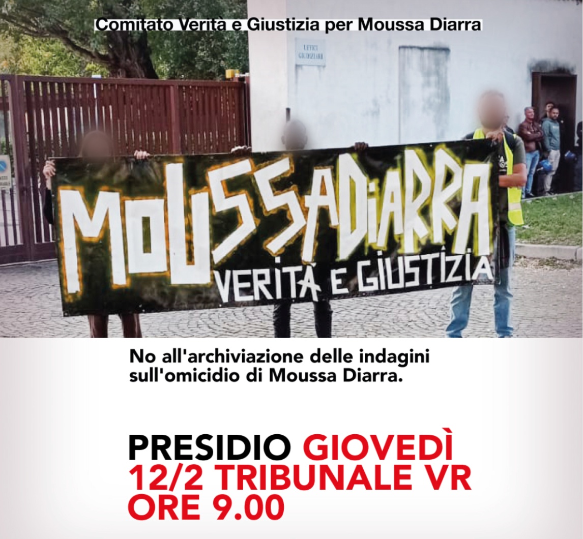 Giovedì 12 febbraio dalle ore 9.00 alle 13.00 si terrà un presidio davanti all’entrata del tribunale di Verona in occasione dell’udienza che deciderà in merito alla richiesta di archiviazione del procedimento per l’omicidio di Moussa Diarra, avvenuto il 20 ottobre 2024.
