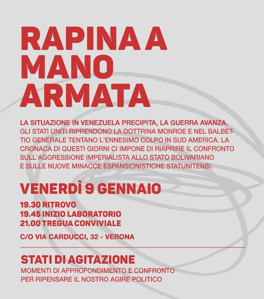 La situazione in Venezuela precipita, la guerra avanza . Gli Stati Uniti riprendono la dottrina Monroe e nel balbettio generale tentano l'ennesimo colpo in Sud America. La cronaca di questi giorni ci impone di riaprire il confronto sull'aggressione imperialista allo Stato bolivariano e sulle nuove minacce espansionistiche statunitensi.